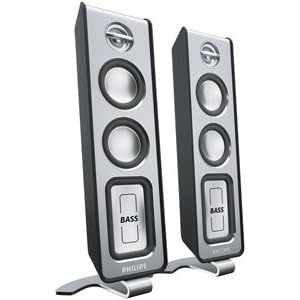 Get a unbelievable;e 2.1 sound experience with a 2.0 system. the 80 watt Phillips Multimedia speaker system sheds the sub woofer, yet still maintains a rich powerful sound. It also includes and exclusive radiator design that uncluttered your desktop.Speakers details2 x speakers. 20W RMS per speaker. 40W RMS total Continuous power 80W RMS Total Peak technology Driver type 2 x 50MM aluminum Woofer driver per speaker 1 x tweeter per speaker 1 x bass Driver per Speaker Controls Volume Indicator Shipping Dimensions: 310mm (h)x220mm(W)X 170mm Depths Shipping weight:3.4lbs Speaker Type : Active Sound Enhancement: Dynamic Bass Boost treble Boost Audio amplifier Neodymium magnets, Mylar :Dome