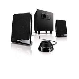 Featuring a subwoofer and enhanced bass boost technology, the Philips SPA1312/27 Multimedia Speakers 2.1 provide exceptional audio with deep bass for virtually all of your audio devices. It's easy to connect to your favorite multimedia device and enjoy all your music, soundtracks, games, and TV shows in resonant, dynamic sound. With their sleek, high-gloss, "piano black" finish, these stylish speakers are the ideal addition to any home-entertainment or computer system.